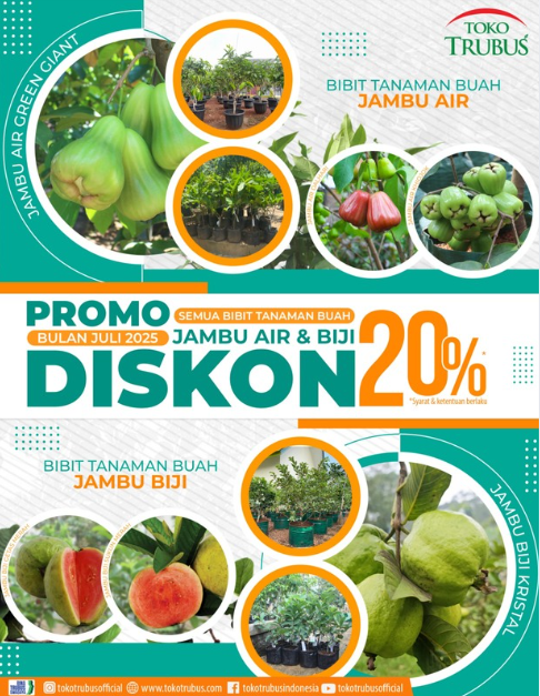 Ada promo spesial sepanjang bulan Juli khusus untuk bibit pohon jambu air dan jambu biji! Jangan lewatkan kesempatan ini dan temukan bibit tanaman jambu pilihan hanya di Toko Trubus! Toko Trubus, Solusi Tanaman Buah Anda!