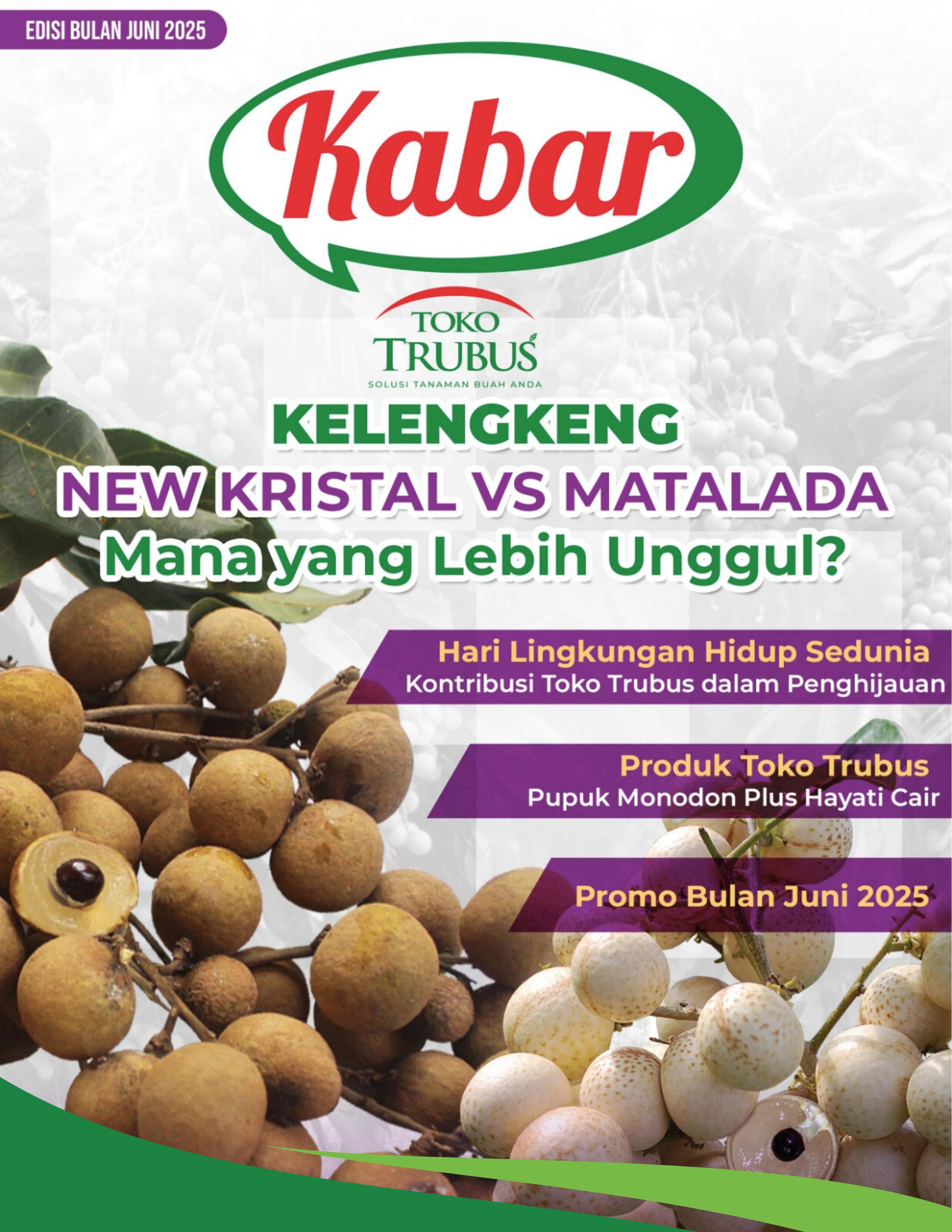 Kabar Toko Trubus Juni 2025 berisi ulasan kelengkeng New Kristal vs Matalada, kontribusi penghijauan Toko Trubus, produk unggulan, serta promo menarik sepanjang Juni.